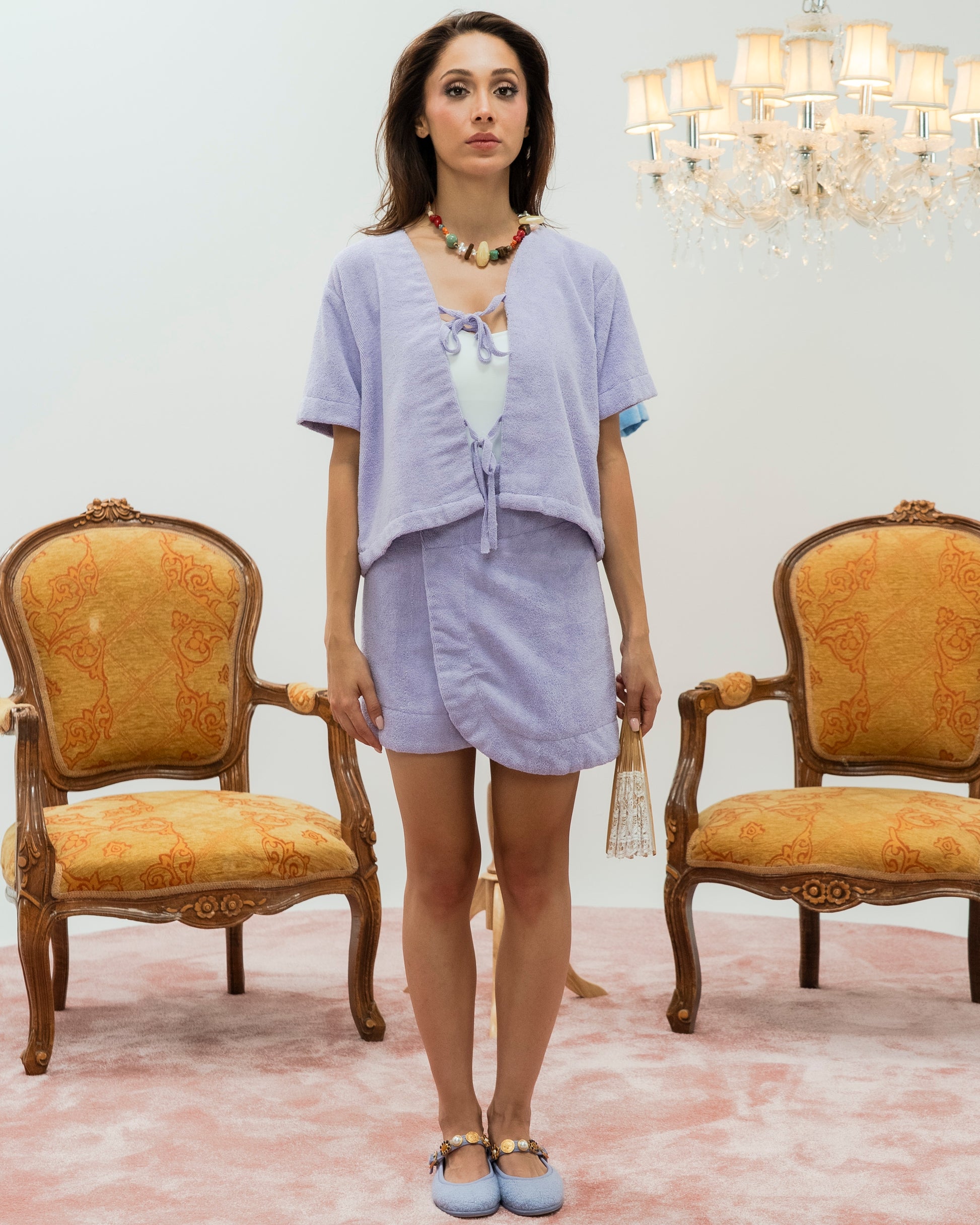 Terry towel two-piece set with a short-sleeve top featuring front bow ties and a wrap skirt secured with a button.
