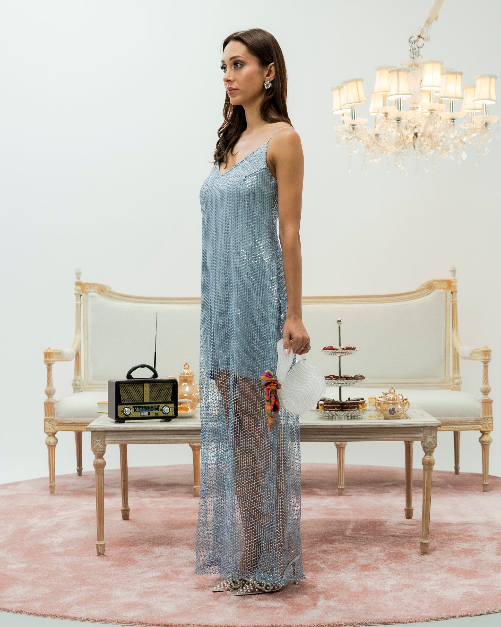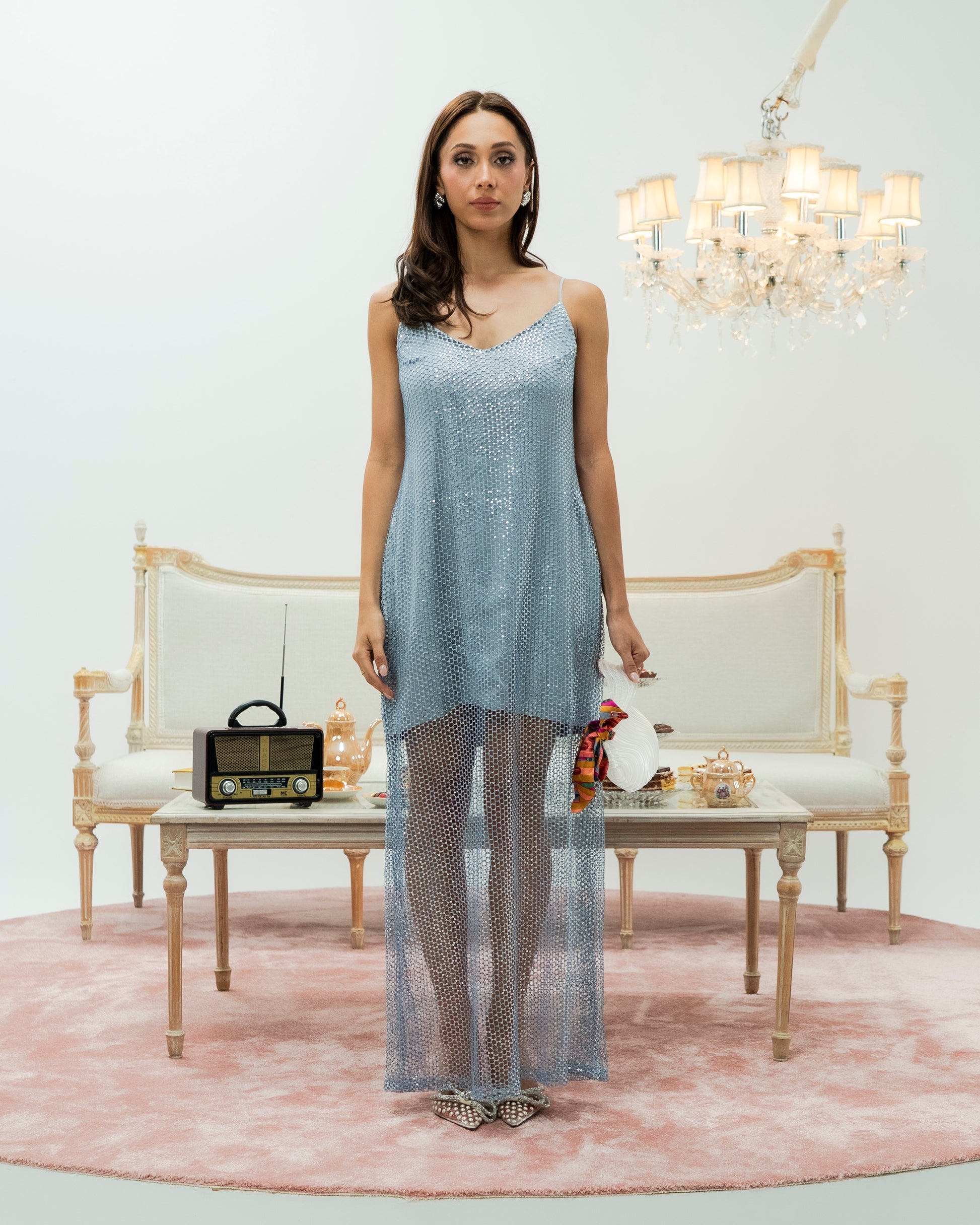 Long mesh dress with a V-neckline and thin straps. Features a short inner lining and an embellished sheer overlay.