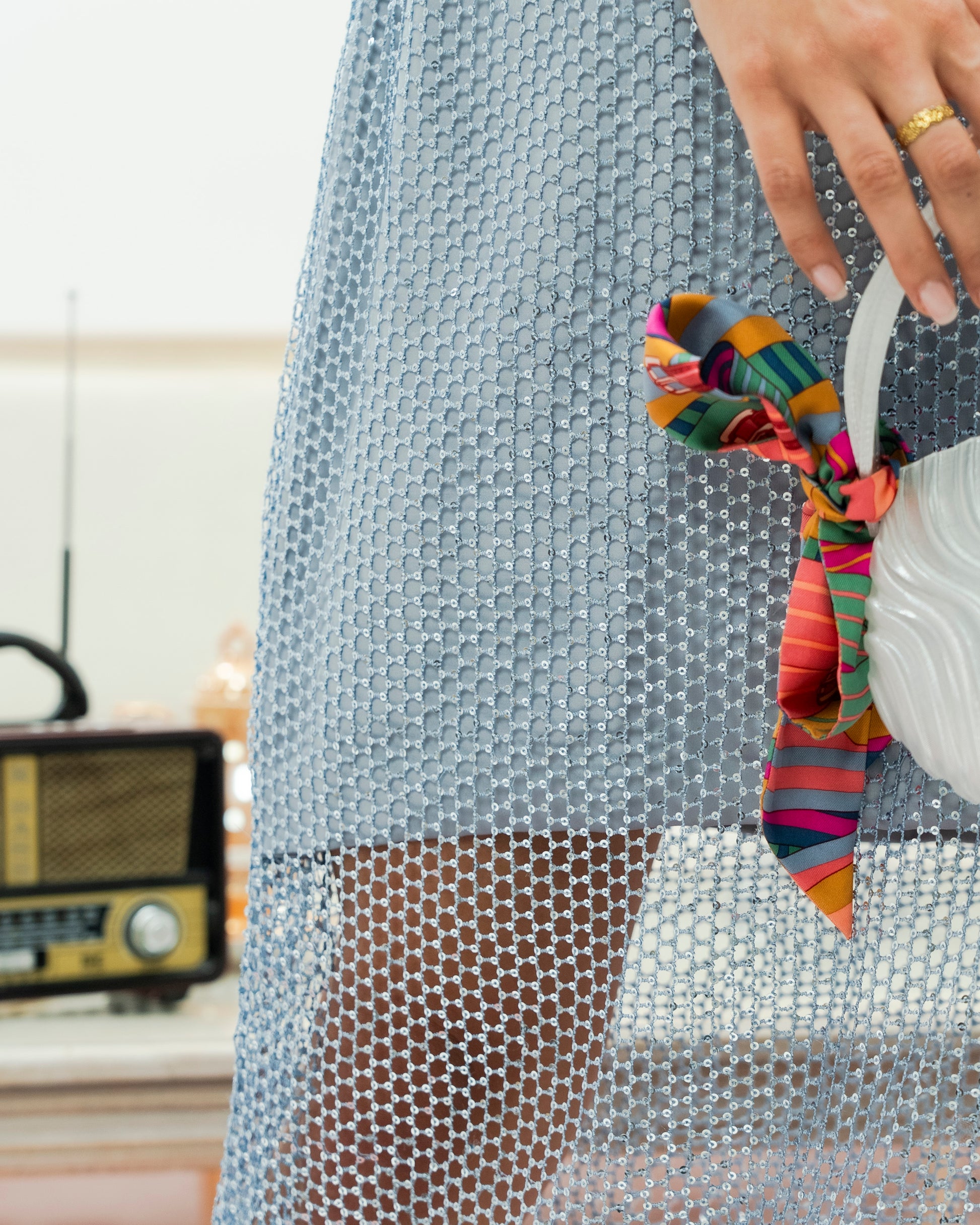 Handwash for best care. Do not tumble dry; heat and tumbling may damage mesh and sequins.